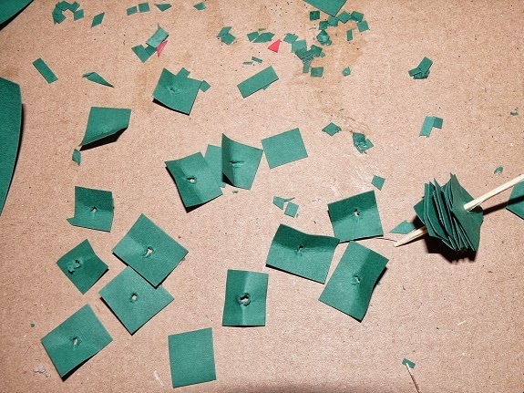 5. Cut small strips ( 3-4 mm wide) from green cardstock, then cut the strips into tiny pieces.